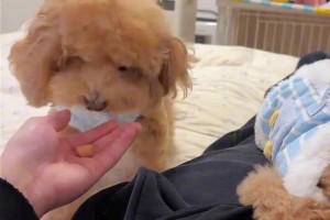 主人偷偷喂小狗,它大气不敢喘