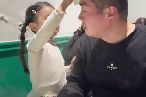吃火锅时,小女儿给爸爸擦汗扇风